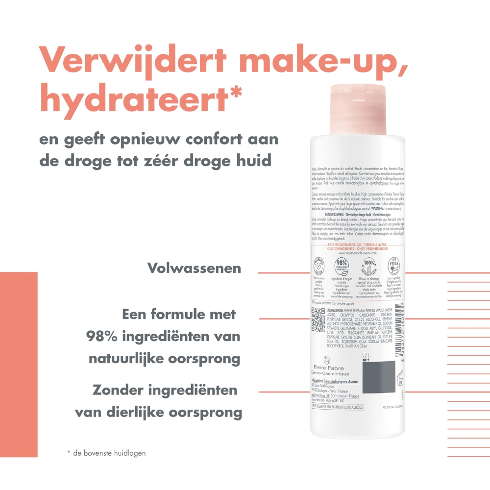 Avène Les Essentiels Reinigingsmelk 200ml reinigt, hydrateert* en laat de droge en zeer droge gevoelige huid comfortabel aanvoelen. Het vermindert ongemakken, waardoor het verwijderen van make-up echt aangenaam wordt. Hij verbetert de hydratatie en behoudt het natuurlijke evenwicht van de huid dankzij de hoge concentratie thermaal water van Avène met kalmerende eigenschappen. Deze subtiel geparfumeerde melk verwijdert make-up en maakt de huid zacht in een snelle en gemakkelijke stap, zonder een vettig laagje achter te laten. De formule bevat enkel de strikt noodzakelijke ingrediënten in de juiste hoeveelheid om dermatologische doeltreffendheid en tolerantie te garanderen**. Geschikt voor dragers van contactlenzen. 98% van de bestanddelen zijn van natuurlijke oorsprong en het product bevat geen bestanddelen van dierlijke oorsprong. De huid is schoon, zacht, gekalmeerd en comfortabel. De verpakking van de Reinigingsmelk 200 ml bevat 84% gerecycled materiaal. Het flesje is gemaakt van 100% gerecycled plastic***. * de opperlagen van de huid. Kinetische studie van de hydratatie tot 6 uur na één enkele toepassing, uitgevoerd bij 23 proefpersonen ** In één centrum uitgevoerd onderzoek bij 33 proefpersonen met een gevoelige huid en gevoelige ogen, met tweemaal daags aanbrengen op gezicht, ogen, lippen en décolleté *** dop niet meegerekend * de opperlagen van de huid. Kinetische studie van de hydratatie tot 6 uur na één enkele toepassing, uitgevoerd bij 23 proefpersonen