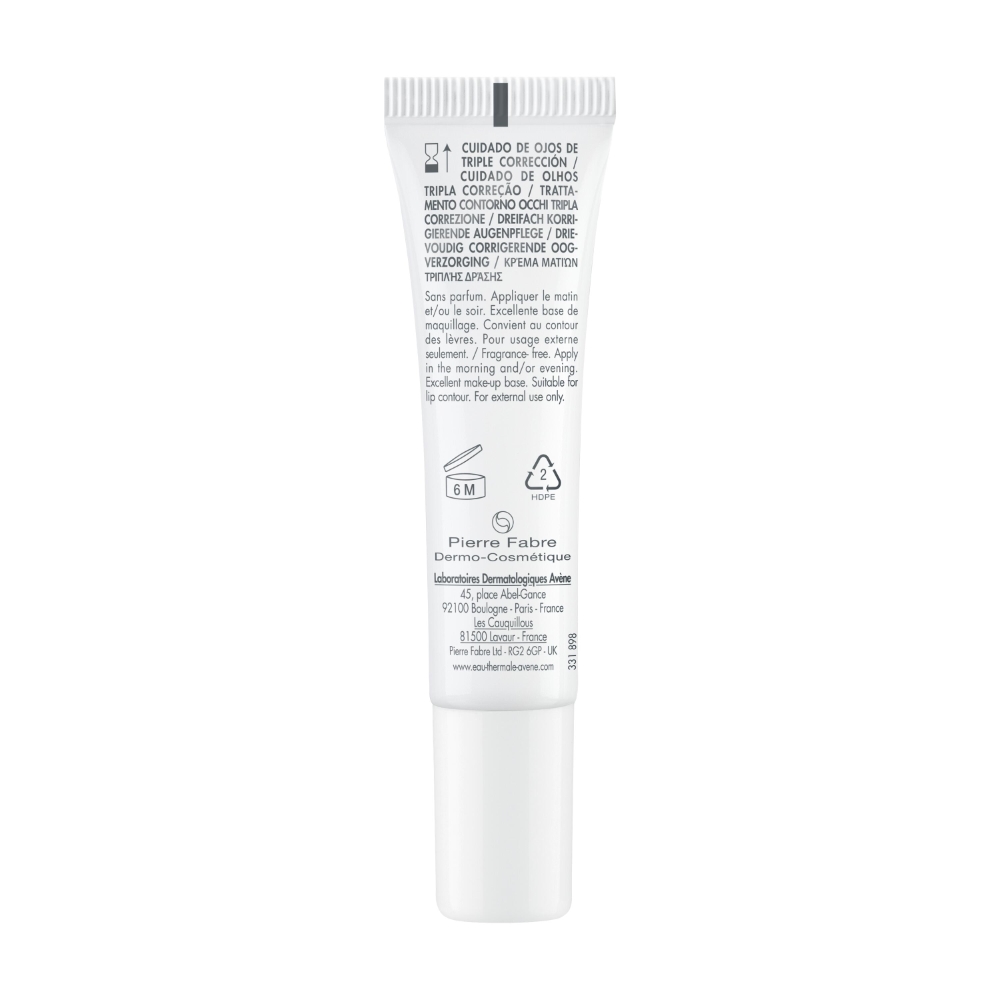 Avène Hyaluron Activ B3 Oogverzorging 15ml met drievoudige corrigerende werking op basis van niacinamide, hyaluronzuur en dextraansulfaat oefent een vollermakende werking uit op de huid van de oogcontour, maakt rimpels glad en dient de huid van de oogcontour een natuurlijke glans toe voor een extra stralende blik. Zonder parfum. Getest op alle huidtypes. De formule is voor 93% samengesteld uit ingrediënten van natuurlijke oorsprong. Plastic tube, voor het overgrote deel bestaande uit recycleerbaar materiaal.
