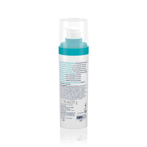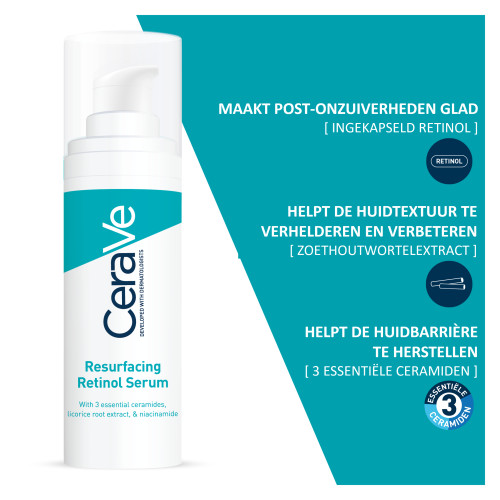 CeraVe Resurfacing Retinol Serum 30ml helpt de zichtbaarheid van restlittekentjes te verminderen, maakt de huid gladder en helpt de huidtextuur te verbeteren. De formule bevat 3 essentiële ceramiden, ingekapseld retinol, een ingrediënt dat bekend staat om het ondersteunen van de natuurlijke celvernieuwing, zoethoutwortelextract en niacinamide en hyaluronzuur om de huid te hydrateren en te verzachten. De MVE-Technologie zorgt voor een langdurige en continue afgifte van actieve bestanddelen.