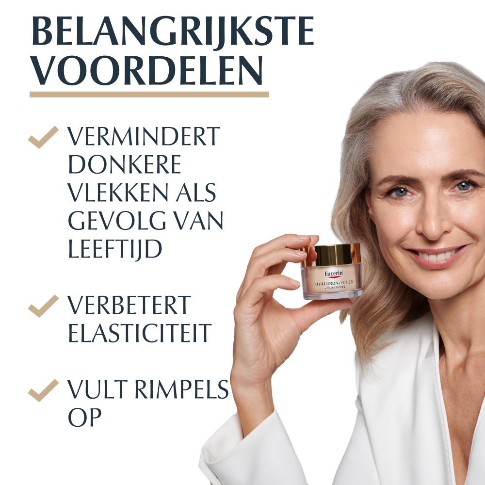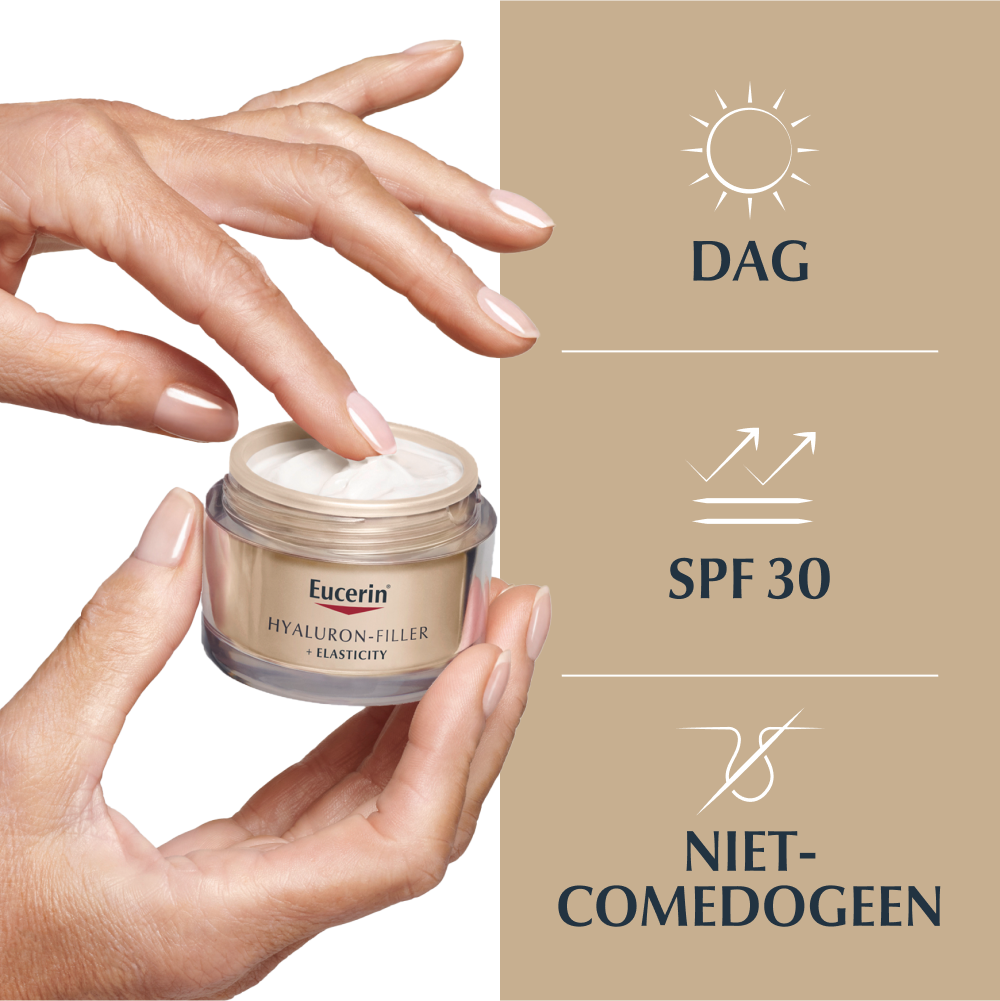 Eucerin Hyaluron-Filler + Elasticity Dagcrème SPF30 50ml is speciaal geformuleerd om gevorderde tekenen van veroudering te verminderen. Naarmate we ouder worden, verandert de structuur van de huid. De huid verliest elasticiteit en stevigheid, terwijl het aantal rimpels en donkere vlekken als gevolg van de leeftijd toeneemt. Resultaat: Een jonger, gladder en stralend uitziende huid. De UVB- (SPF 15) + UVA-bescherming voorkomen effectief UV-geïnduceerde vroegtijdige huidveroudering en het verdiepen van rimpels. Klinische en dermatologische studies bewijzen: zeer goede huidverdraagzaamheid en effectiviteit. Uitstekende make-up basis. Niet-comedogeen.