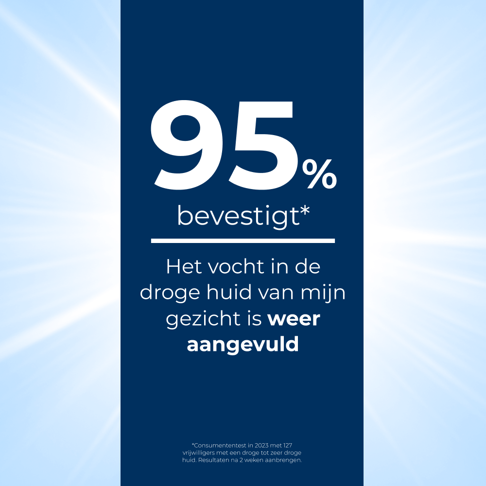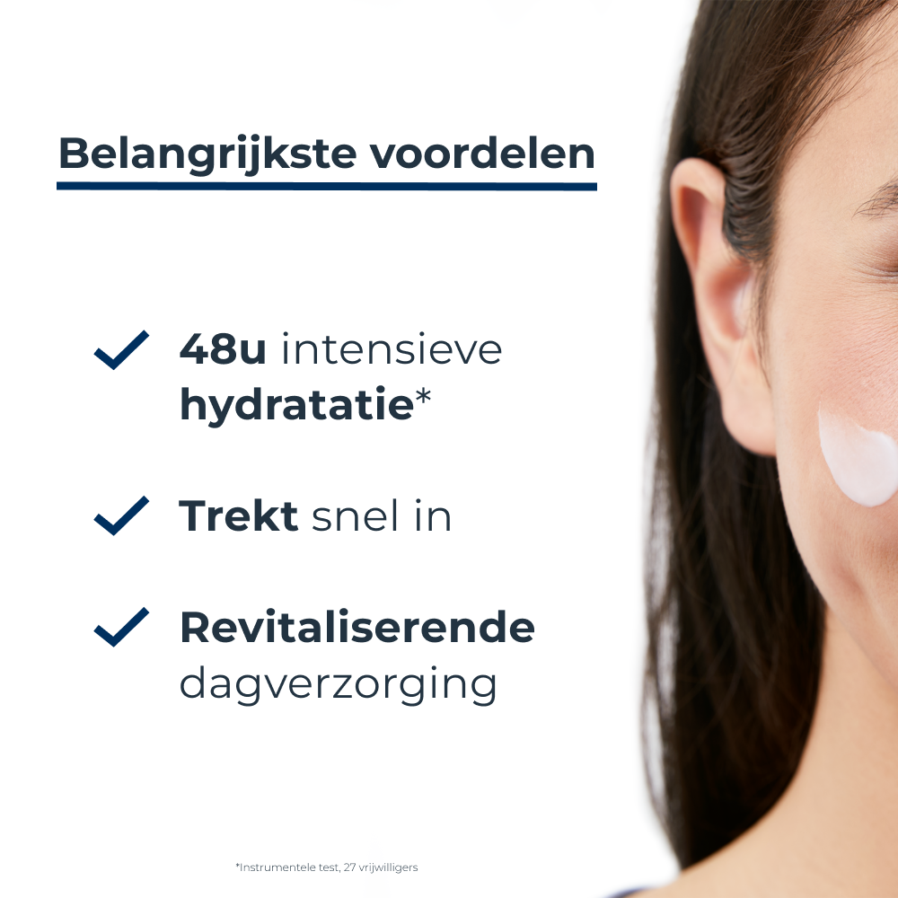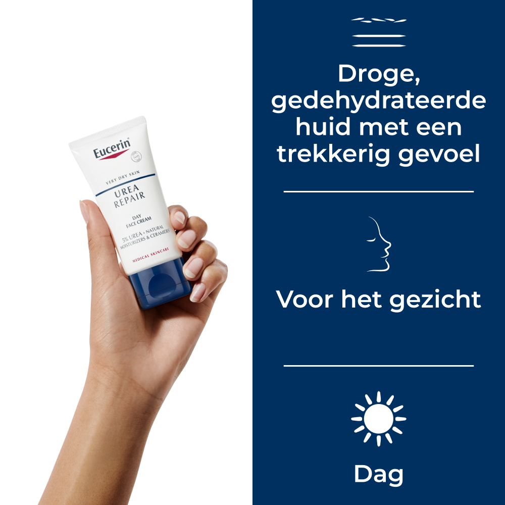 Eucerin UreaRepair 48H Dagcrème 5% Urea 50ml bevat een unieke formule met combinatie van 5% Urea + Ceramiden & Natuurlijke Hydratatiefactoren (NMF) - voor onmiddellijke verlichting van de tekenen van droge gezichtshuid en een trekkerig gevoel. Urea & NMF verbeteren het vermogen van de huid om water te binden, waardoor het vochtgehalte toeneemt. De formule met lipiden zoals Ceramiden voorkomt vochtverlies. Resultaat: Intense hydratatie gedurende 48U*. De crème trekt snel in, hydrateert onmiddellijk en vermindert het trekkerig gevoel. Klinische en dermatologische studies bewijzen het: Zeer goede effectiviteit en huidtolerantie op een zeer droge huid of bij de huid die vatbaar is voor huidaandoeningen. *Instrumentele test, 27 vrijwilligers