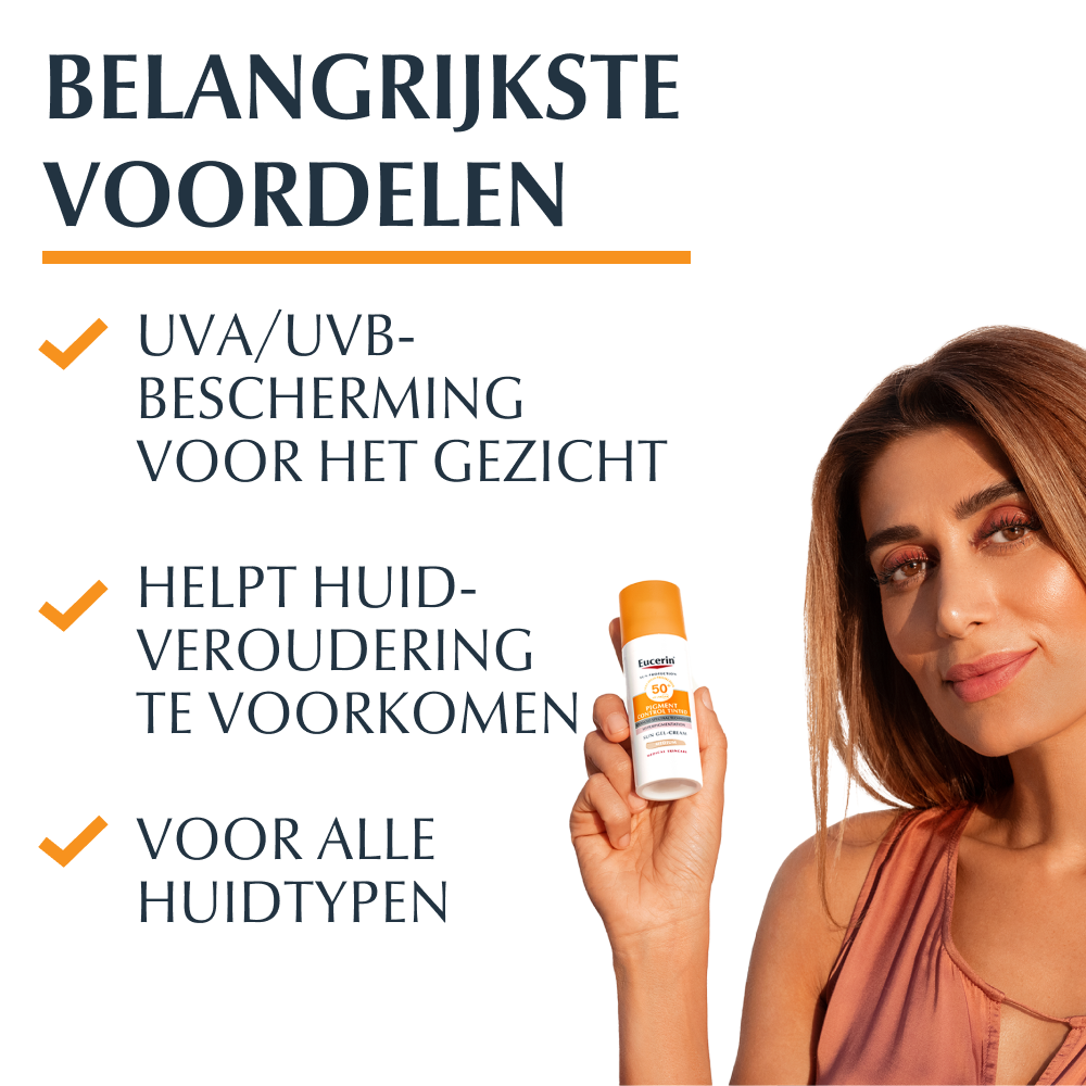 Eucerin Sun Photoaging Control SPF50+ Tinted Medium 50ml is een zonbeschermingproduct voor iedere dag voor het gezicht die onmiddellijk helpt de teint egaler te maken en de tekenen van veroudering zoals fijne lijntjes of oneffenheden zichtbaar helpt verminderen. De Advanced Spectral Technology combineert breedband- en fotostabiele UVA-/UVB-filters1 voor zeer hoge UV-bescherming met Licochalcone A om de door UVA-straling en HEVIS-licht veroorzaakte vrije radicalen te neutraliseren. Eucerin Photoaging Control Sun Crème Getint SPF 50+ Medium bevat een hoge zonbeschermingsfactor die photoaging helpt voorkomen. Eucerin Photoaging Control Sun Crème Getint SPF 50+ Medium blijft lang zitten en wordt snel opgenomen dankzij de lichte, ongeparfumeerde en niet-plakkerige textuur.