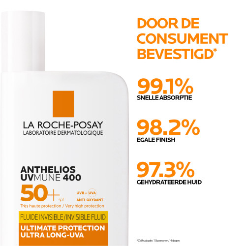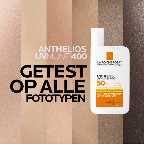 La Roche-Posay Anthelios UVMune 400 Onzichtbare Zonnebrand Fluide SPF50+ 50ml bevat MEXORYL 400, het meest effectieve UV-filter tegen de meest doordringende UV-stralen. Getest op gevoelige, reactieve en intolerante huid. Geschikt voor alle huidtypen, alle fototypen. Zeer resistent tegen water en zand. Prikt niet in de ogen. Onzichtbare, lichtgewicht textuur. Niet geparfumeerd. Ook geschikt voor huid met neiging tot allergie, met name zonneallergie. Kan rond de ogen worden opgebracht. Prikt niet in de ogen. Hypoallergeen. Voor alle huidtypen en fototypen. Werkzaamheid klinisch bewezen in onderzoeken, getest onder dermatologisch en oogheelkundig toezicht bij consumenten met verschillende fototypes (I-VI). Zichtbare resultaten bevestigd door gebruikers*: Onmiddellijk na gebruik: 99,1% - De huid voelt comfortabel aan Na 14 dagen: 97,3% - De huid voelt gehydrateerd aan 98,2% - Het product geeft een schone finish 99,1%- Het product wordt snel opgenomen 97,3% - Het product laat na het aanbrengen geen witte vlekken op de huid achter.* *Klinische studie bij 113 proefpersonen.