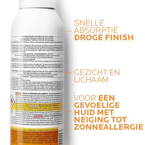 La Roche-Posay Anthelios Lichaamsmist SPF50+ 200ml is een hoge bescherming in spray-formaat voor het praktisch en eenvoudig aanbrengen van je zonnebrand. De sluierachtige mist voelt fris en licht aan, zonder witte strepen. Volledig onzichtbare mist textuur met hoge SPF50+ voor het lichaam, waarbij je de spray zelfs op zijn kop (360 graden) kunt aanbrengen. Hiermee kun je in je eentje dus ook moeilijk te bereiken delen (zoals de rug) gemakkelijk in sprayen. Anthelios Zonnebrand mist met SPF 50+ is geschikt voor een zongevoelige huid, volgens onderzoek Deze zonnebrand met factor 50+ heeft een klinisch bewezen efficiëntie op de zongevoelige huid, aangetoond met 29 in-vivo studies door dermatologische experts in fotodermatologie.