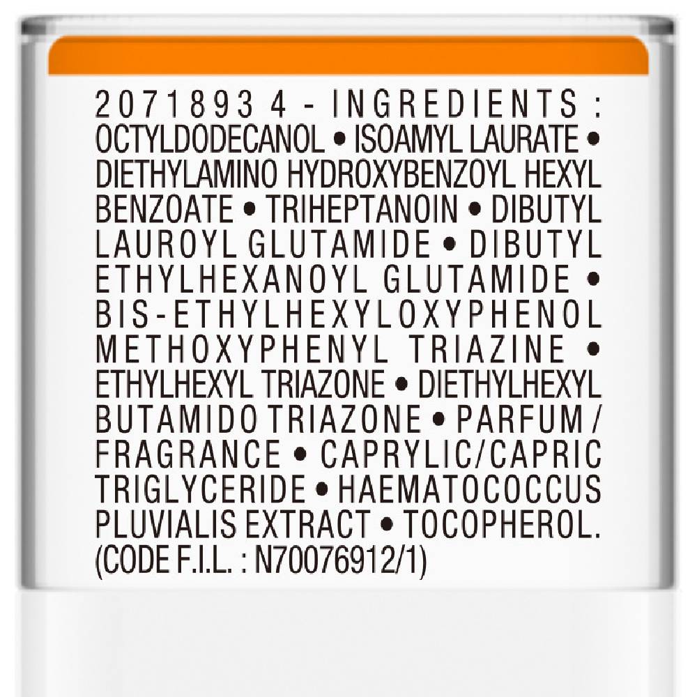 INGREDIENTS: OCTYLDODECANOL • ISOAMYL LAURATE • DIETHYLAMINO HYDROXYBENZOYL HEXYL BENZOATE • TRIHEPTANOIN • DIBUTYL LAUROYL GLUTAMIDE • DIBUTYL ETHYLHEXANOYL GLUTAMIDE • BIS-ETHYLHEXYLOXYPHENOL METHOXYPHENYL TRIAZINE • ETHYLHEXYL TRIAZONE • DIETHYLHEXYL BUTAMIDO TRIAZONE • PARFUM / FRAGRANCE • CAPRYLIC/CAPRIC TRIGLYCERIDE • HAEMATOCOCCUS PLUVIALIS EXTRACT • TOCOPHEROL (F.I.L. N70076912/1).