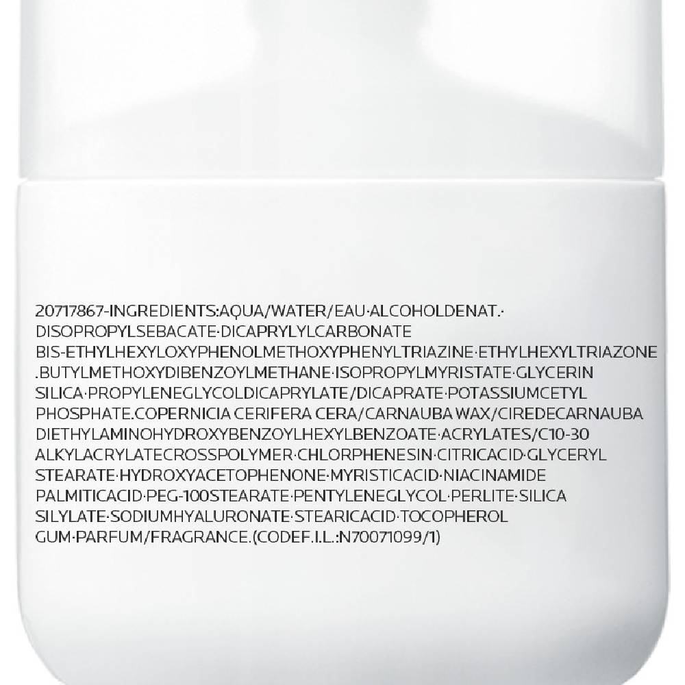 INGREDIENTS: AQUA / WATER / EAU • ALCOHOL DENAT. • DIISOPROPYL SEBACATE • DICAPRYLYL CARBONATE • BIS-ETHYLHEXYLOXYPHENOL METHOXYPHENYL TRIAZINE • ETHYLHEXYL TRIAZONE • BUTYL METHOXYDIBENZOYLMETHANE • ISOPROPYL MYRISTATE • GLYCERIN • SILICA • PROPYLENE GLYCOL DICAPRYLATE/DICAPRATE • POTASSIUM CETYL PHOSPHATE • COPERNICIA CERIFERA CERA / CARNAUBA WAX / CIRE DE CARNAUBA • DIETHYLAMINO HYDROXYBENZOYL HEXYL BENZOATE • ACRYLATES/C10-30 ALKYL ACRYLATE CROSSPOLYMER • CHLORPHENESIN • CITRIC ACID • GLYCERYL STEARATE • HYDROXYACETOPHENONE • MYRISTIC ACID • NIACINAMIDE • PALMITIC ACID • PEG-100 STEARATE • PENTYLENE GLYCOL • PERLITE • SILICA SILYLATE • SODIUM HYALURONATE • STEARIC ACID • TOCOPHEROL • TRIETHANOLAMINE • TRISODIUM ETHYLENEDIAMINE DISUCCINATE • XANTHAN GUM • PARFUM / FRAGRANCE (F.I.L. N70071099/1).