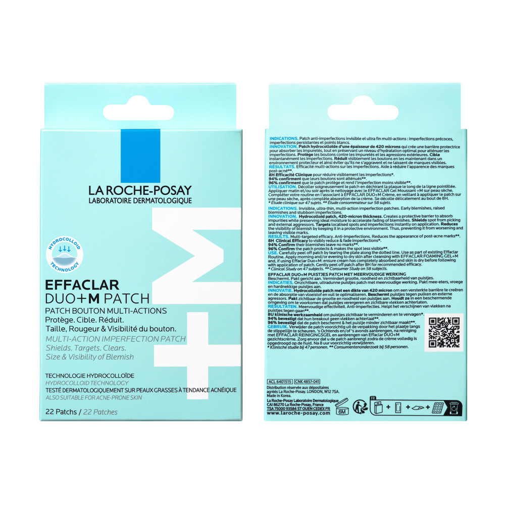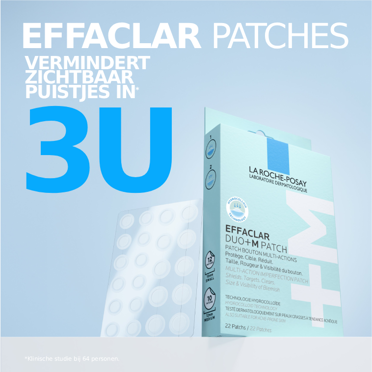 La Roche-Posay Effaclar Duo+M Patch 22 Patches is een anti-puistjes patch die onzuiverheden zichtbaar vermindert en vervaagt binnen 8 uur*. Geformuleerd met behulp van hydrocolloïde technologie, de patch creëert een beschermend laagje om de huid gehydrateerd te houden terwijl het onzuiverheden absorbeert. De patch versnelt het genezingsproces, waardoor onzuiverheden sneller verdwijnen. De dikte van de patch is geschikt voor een acnegevoelige huid en zorgt voor een optimale toepassing en vermindering van puistjes. Onzichtbaar resultaat, ultradunne dikte: 420 micron. Dermatologisch getest. Verkrijgbaar in twee maten: 12 kleine patches en 10 middelgrote patches. *Klinische studie, 47 proefpersonen, na 1 toepassing. Klinische effectiviteit: na 8 uur* zijn onzuiverheden zichtbaar verminderd en verzacht. 94% van de gebruikers zegt dat hun puistjes geen sporen achterlaten**. 96% van de gebruikers zegt dat hun patch het puistje beschermt en minder zichtbaar maakt**. *Klinische studie, 47 proefpersonen, na 1 toepassing. **Zelfbeoordeling, 58 onderwerpen, na 1 toepassing.