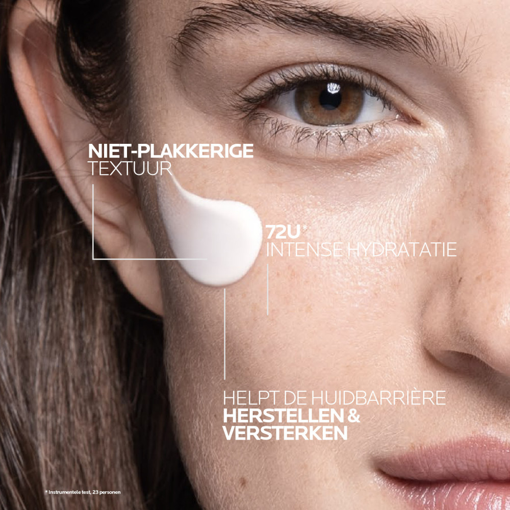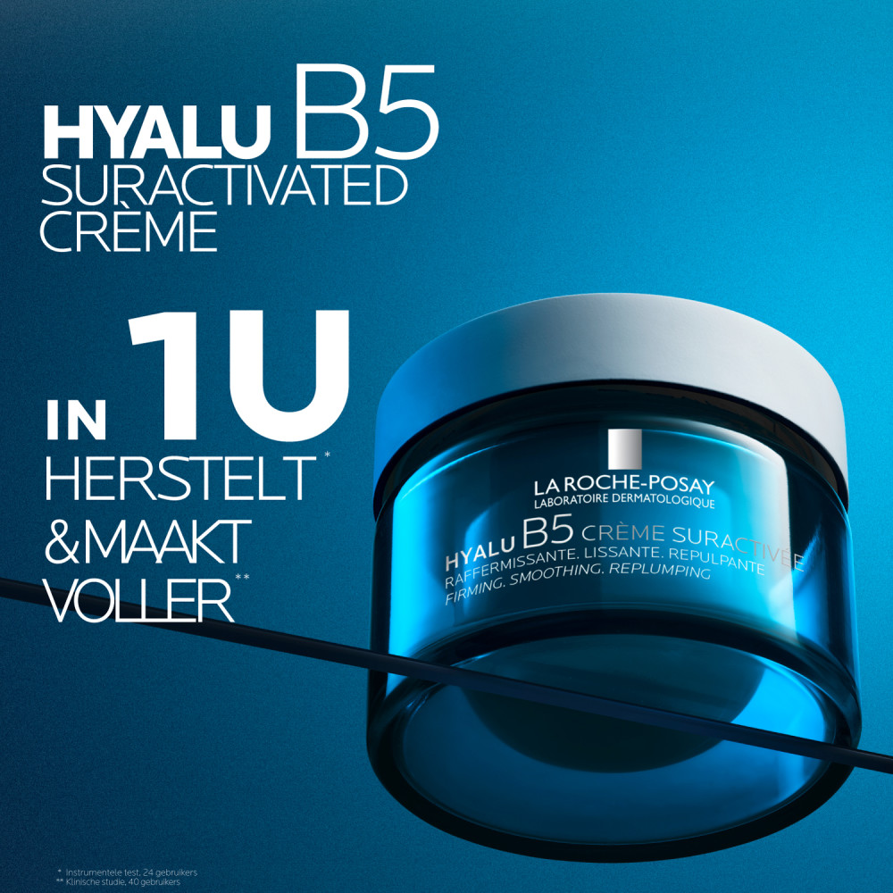 La Roche-Posay Hyalu B5 Suractivated Crème 50ml is een dagelijkse verstevigende anti-ageing crème die de huid hydrateert en tekenen van huidveroudering, zoals rimpels en huidverslapping, effectief aanpakt. Deze innovatieve formule helpt de huidbarrière al binnen 1 uur* te herstellen en biedt 72 uur intensieve hydratatie*. De combinatie van hyaluronzuur en vitamine B5 helpt de huidbarrière optimaal vocht vast te houden, waardoor de huid voller oogt en rimpels zichtbaar worden verminderd. Het resultaat is een gehydrateerde, stevigere huid met verbeterde elasticiteit en een soepele, jeugdige uitstraling. * Instrumentele test, 24 personen. La Roche-Posay Hyalu B5 Suractivated Crème is verrijkt met hyaluronzuur, bekend om zijn intens hydraterende werking. Het helpt de huid voller en gladder te maken, terwijl fijne lijntjes en rimpels zichtbaar verminderen. Vitamine B5 ondersteunt het natuurlijke herstel van de huidbarrière en versterkt de huid van binnenuit. De lichte, niet-plakkerige textuur voelt comfortabel aan en biedt tot 72 uur intensieve hydratatie. De hypoallergene, niet-comedogene formule is geschikt voor alle huidtypes, zelfs een gevoelige huid. Ideaal voor dagelijks gebruik, zowel 's ochtends als 's avonds, voor een gehydrateerde, soepelere en zichtbaar gezondere huid. Hersteld en maakt voller in 1U*. 86% van de gebruikers vindt dat de huid zachter aanvoelt na het eerste gebruik.* 63 % van de gebruikers vindt dat fijne lijntjes na 7 dagen zichtbaar verminderd zijn.* 81% van de gebruikers vindt dat de huid na 1 maand steviger uitziet.** *Herstel van de huidbarrière, instrumentele test 24 personen en klinische studie, 40 personen. **Consumententest, 60 personen, 2x/dag aanbrengen gedurende 3 maanden.