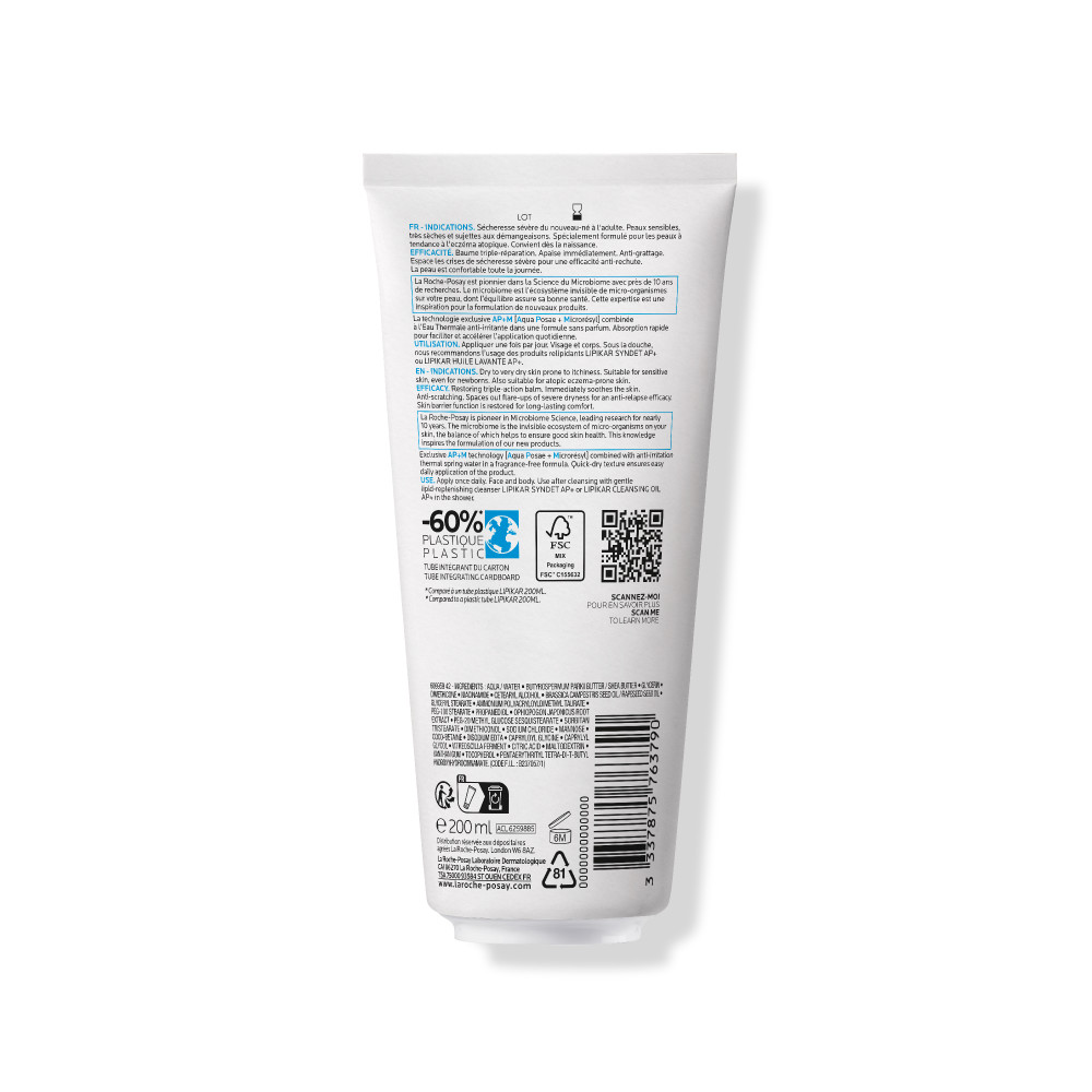 La Roche-Posay Lipikar Baume AP+M Eco-tube 200ml heeft een drievoudige werking voor een droge huid met neiging tot atopisch eczeem. De balsem verzacht de huid onmiddellijk, vermindert het krabben door droogheid en helpt tegen terugvallen naar een zeer droge huid. De balsem voelt zijdezacht, rijk crèmig en toch fris aan. Trekt snel in, zonder een vettig of plakkerig laag achter te laten. Optimale tolerante bij een gevoelige huid Lipikar Baume AP+m is geformuleerd op basis van een nieuwe microbioom (verzameling micro-organismen op de huid) technologie. Dankzij de karitéboter* en canola-olie in de formule wordt de hydrolipidenfilm aangevuld en herstelt. Niacinamide helpt tegen jeuk en het thermaal water van La Roche-Posay verzacht. De balsem ondersteunt de natuurlijke huidbarrière en beschermt ze, waardoor periodes van een zeer droge huid minder vaak voorkomen. De Lipikar Balsem AP+M is op meer dan 700 personen onder dermatologisch en pediatrisch toezicht getest en geschikt voor het hele gezin: baby's, kinderen en volwassenen. Lipikar Baume AP+m kalmeert en helpt huidcomfort, volgens onderzoek Volgens onderzoek met Lipikar Baume AP+m blijkt het volgende: - 92% vindt dat een trekkerig gevoel is verminderd na de eerste applicatie*. - 80% vindt dat de huid gekalmeerd aanvoelt na 4 weken*. - 100% vindt dat de huid van hun baby soepel aanvoelt**. - 96% vindt dat het huidcomfort van hun baby verbeterd lijkt**. *Zelfevaluatie bij 50 personen. **Zelfevaluatie bij de ouders van 54 baby’s na 4 weken gebruik
