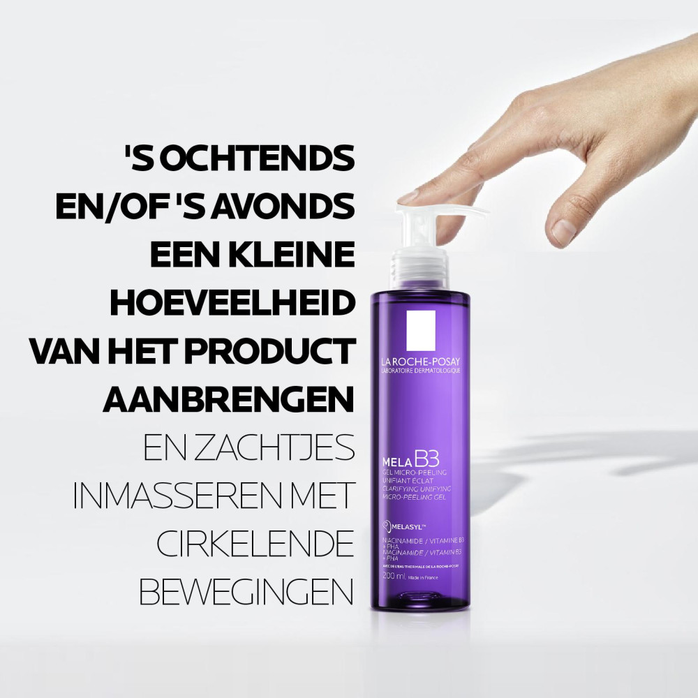 La Roche-Posay Mela B3 Micro-Peeling Gel Reiniger 200ml tegen pigmentvlekken van La Roche Posay is een gezichtsreiniger die de huid egaliseert en verheldert. Geschikt voor alle huidtypes, zelfs voor een gevoelige huid, en zelfs voor de huid die gevoelig is voor pigmentvlekken. Formule verrijkt met ons nieuwe revolutionaire gepatenteerde actieve ingrediënt Melasyl dat overtollige melanine verwijdert voordat het de huid aantast. De gel helpt pigmentvlekken te verminderen, en egaliseert en verheldert tegelijkertijd de huid. De reiniger bevat ook niacinamide om de huid te kalmeren en de huidbarrière te versterken, en thermaal bronwater van La Roche-Posay, dat op natuurlijke wijze hydrateert en verzacht. Dankzij de schuimende, lichte en uiterst comfortabele textuur is dit product erg aangenaam en ideaal voor dagelijks gebruik. De Mela B3 Micro-Peeling Gel Reiniger bevat geen alcohol, is niet-comedogeen, is dermatologisch getest op de huid die gevoelig is voor hyperpigmentatie en wordt aanbevolen door dermatologen, net als alle producten van La Roche-Posay, het nummer 1 aanbevolen merk door dermatologen wereldwijd. Vanaf 4 weken* ziet de teint er egaler uit en is de huid zichtbaar stralender. Vanaf 8 weken** zijn pigmentvlekken minder zichtbaar. (*Zelfevaluaties, 167 consumenten; **Klinische studie, 50 vrouwen, 8 weken).