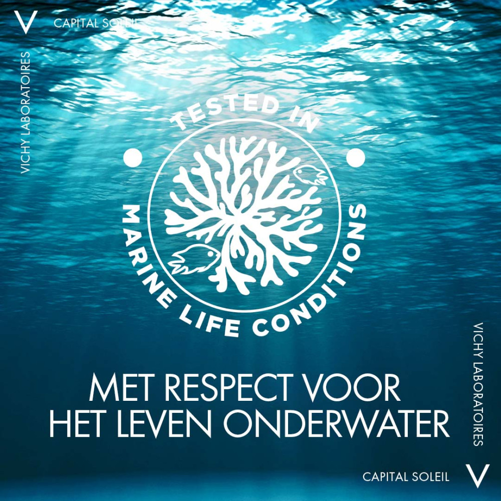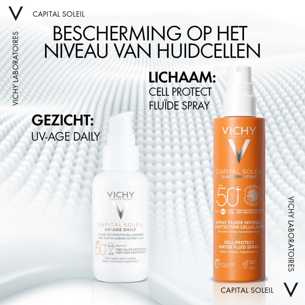 Vichy Capital Soleil Cell Protect Fluïde Spray SPF50+ 200ml is verrijkt met hydraterend hyaluronzuur en priobiotische fracties. Hierdoor is het geschikt voor gezicht en lichaam. SPF50+ en hypoallergeen. Samengesteld met gepatenteerde Netlock-technologie, een ultradunne UV-beschermde laag die als een ‘netwerk’ op de huid blijft zitten. Ook zorgt deze technologie ervoor dat de formule resistent is tegen water, zweten en zand.