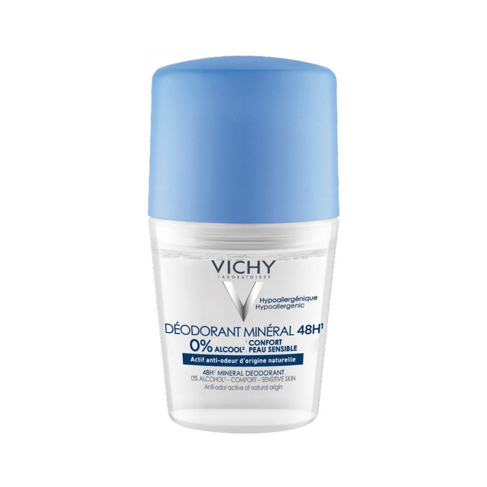 Vichy Minéral Deodorant Roller 48u Optimale Tolerantie 50ml is zachter en milder voor de huid onder de oksels (zeker wanneer deze last heeft van gevoeligheden) aangezien het bestaat uit een natuurlijk mineraal zout, aangenaam om te gebruiken op vrijwel elk deel van het lichaam. De Deodorant roller werkt kalmerend en vermindert onaangename geurtjes. Vichy Deodorant Mineraal Roller 48u prikt niet na het scheren, volgens onderzoek Uit onderzoek met deze Deodorant roller blijkt de efficiëntie van het product*: • 84% van de testpersonen vindt dat het de huid kalmeert en irritaties door scheren vermindert; • 94% vindt dat de huid comfortabel aanvoelt; • 98% vindt dat het product zacht is bij het aanbrengen. *Zelfevaluatie, 51 consumenten na 4 weken gebruik. Vichy is nummer 1 in deodorants in de apotheek* *IMS INTERNATIONAAL, NEDERLAND, DEODORANT EN ANTI-TRANSPIRANT, SELL-OUT IN WAARDE, YTD MAART 2020