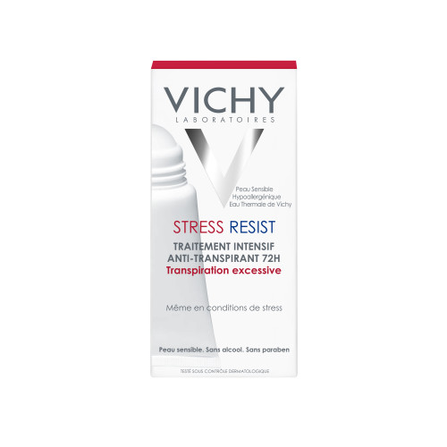 Vichy Deodorant Stress Resist Anti Overmatige Transpiratie 72 uur Roller 50ml bevat een verzachtende formule, die soepel over de huid glijdt zonder een irriterend of prikkend gevoel op te wekken. Lichtgewicht, niet-plakkerig en niet-vettig. Droogt snel. Blijf fris en droog onder hevige stress of stressvolle piekmomenten met deze speciale Vichy Deodorant waarmee je zweetplekken door stress verslaat. Voor mannen en vrouwen die een extreem effectieve anti-transpirante werking zoeken, maar deze ook willen combineren met een bijzonder hoge tolerantie voor de huid. Vichy Deodorant roller biedt 72 uur lang bescherming, volgens onderzoek Uit onderzoeksresultaten blijkt dat deze Deodorant tot 72uur lang een anti-transpirante werking* heeft, zelfs effectief tijdens stresspieken. *Instrumentale test. Vichy is nummer 1 in deodorants in de apotheek* *IMS INTERNATIONAAL, NEDERLAND, DEODORANT EN ANTI-TRANSPIRANT, SELL-OUT IN WAARDE, YTD MAART 2020