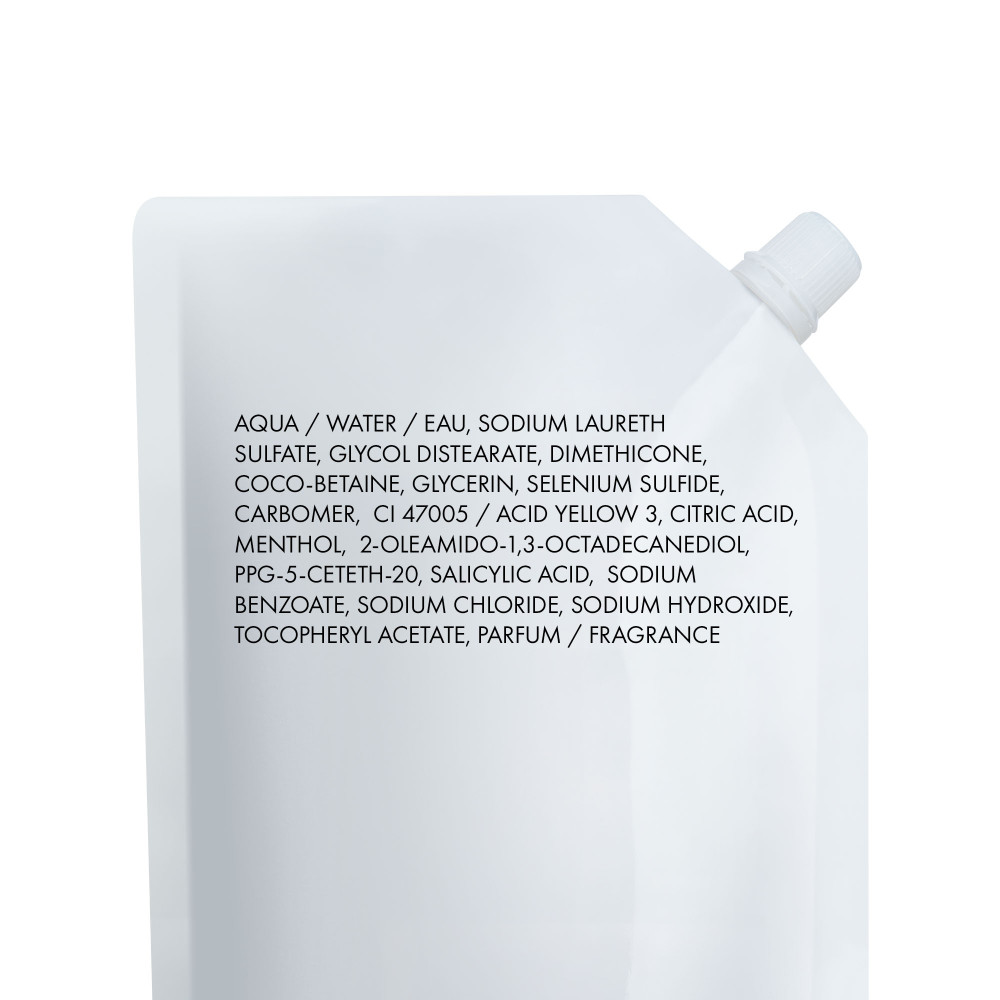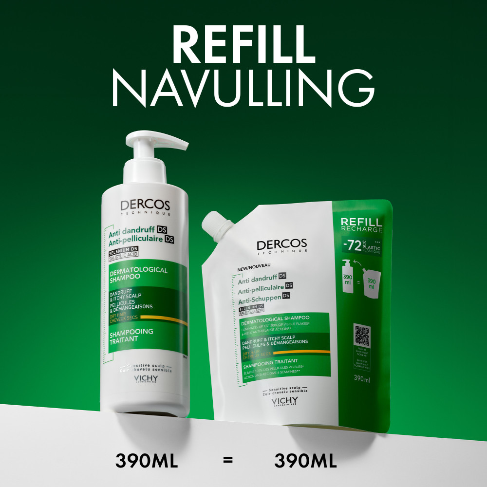 Vichy Dercos Anti-Roos DS Shampoo Navulling 390ml is een dubbele verzorging tegen schilfers en een jeukende hoofdhuid. De formule is speciaal ontwikkeld voor mannen en vrouwen met droog haar die van roos en jeuk af willen. Selenium DS (Seleniumdisulfide) is een krachtig, natuurlijk ingrediënt dat dermatologisch erkend is vanwege zijn doeltreffendheid. Het bestrijdt roos effectief en verwijdert zelfs de meest hardnekkige schilfers. De herstellende werking op het microbioom kalmeert de hoofdhuid en helpt de vorming van roos te verminderen. Geniet van de ecologische verpakking die gemaakt is van 72% minder plastic*. Dercos Anti-Roos DS Shampoo biedt een combinatie van actieve ingrediënten, waaronder Selenium DS en Salicylzuur. De innovatieve formule pakt roos bij de bron aan door de onderliggende oorzaak te behandelen. Tot 100% minder zichtbare roos** en tot 6 weken anti-terugval effect***. Het microbioom van de hoofdhuid is al na vier weken weer in balans****. Dercos Anti-Roos pakt niet alleen roos aan, maar verzacht ook de hoofdhuid, verlicht jeuk en vermindert het ongemak dat vaak met roos gepaard gaat. DERCOS, de dermatologische expert in hoofdhuid- en haarverzorging, aanbevolen door dermatologen wereldwijd. Al 50 jaar staat bij ons de verzorging van de hoofdhuid centraal, omdat gezond haar bij een gezonde hoofdhuid begint. Wij maken gebruik van actieve bestanddelen die door dermatologen erkend zijn en beoordelen onze doeltreffendheid met klinische en instrumentele tests. Al onze haarverzorgingsproducten worden getest onder dermatologisch toezicht om optimale veiligheid en tolerantie te garanderen. *Vergeleken met de fles van 390 ml. **Consumententest bij 262 personen na 2 weken regelmatig gebruik - Italië. ***Klinische studie met 32 personen na 4 weken gebruik en 6 weken anti-terugval. ****Klinische studie met opvolging van de belangrijkste micro-organismen die betrokken zijn bij roos, 56 personen met 3 toepassingen per week gedurende 4 weken. Tot 100% minder zichtbare roos vanaf de eerste wasbeurt***. Anti-terugval gedurende 6 weken**. Herstelt het microbioom na 4 weken***. Kalmeert de hoofdhuid en verlicht jeuk en ongemak. *Consumententest bij 262 personen na 2 weken regelmatig gebruik - Italië. **Klinische studie met 32 personen na 4 weken gebruik en 6 weken anti-terugval. ***Klinische studie met opvolging van de belangrijkste micro-organismen die betrokken zijn bij roos, 56 personen met 3 toepassingen per week gedurende 4 weken.