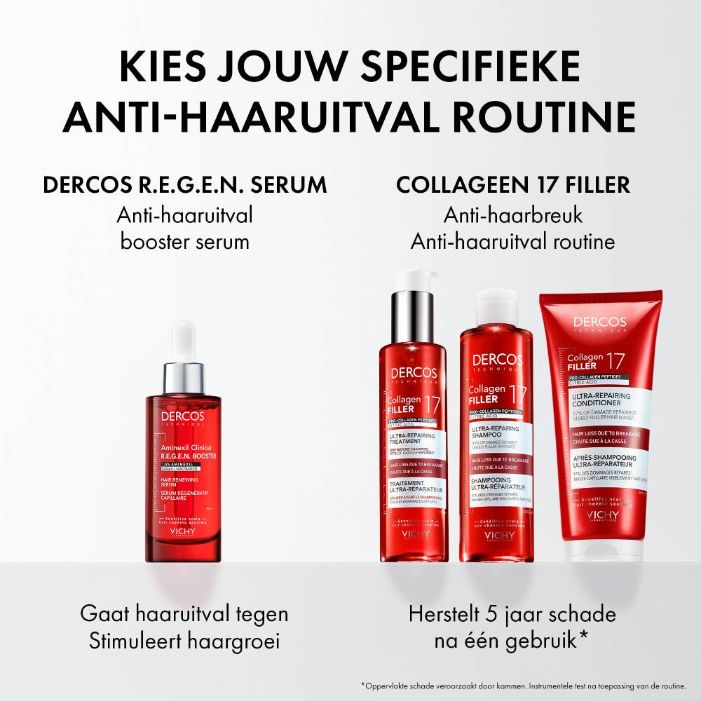 Transformeer je haar en hoofdhuid met Vichy Dercos Collagen 17 Filler, de herstellende verzorgingsroutine van Dercos, het n°1 haarverzorgingsmerk volgens dermatologen.