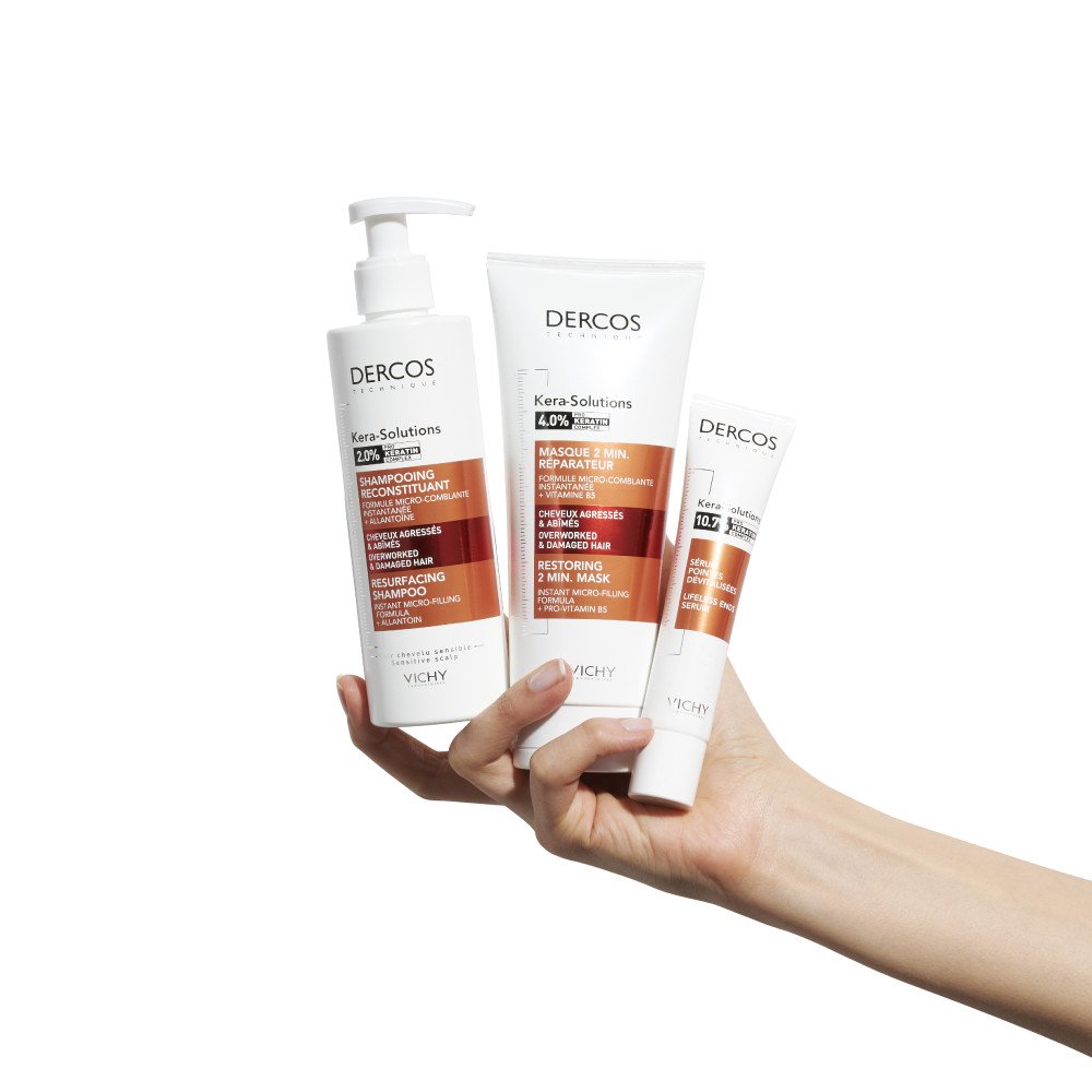 Vichy Dercos Kera Solutions Herstellende Shampoo 250ml is een behandelende shampoo voor dof, ruw, breekbaar haar. Chemische, mechanische en thermische agressoren beschadigen de haarstructuur diep en verminderen keratine. Het haar is zeer beschadigd: ruw, dof, breekbaar... Deze herstellende shampoo combineert een micro-vullende formule met een Pro-keratine complex om het haar in één enkele toepassing te herstellen, ideaal voor zeer beschadigd haar door behandelingen of de zon in de zomer.