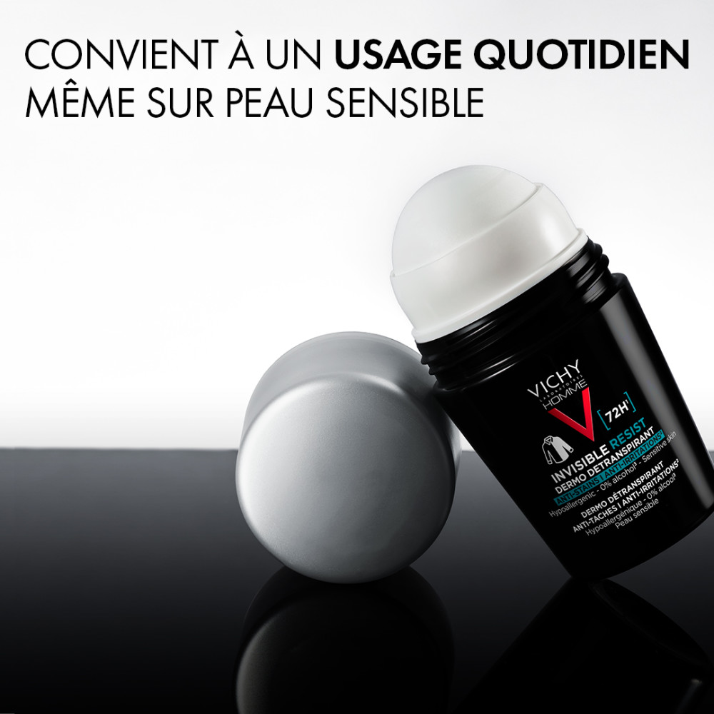 Vichy Homme Invisible Resist 72h Anti-Transpirant Deodorant Roller 50ml is speciaal ontwikkeld voor mannen. Het heeft een doeltreffende werking tegen vochtigheid en geurtjes en biedt optimale tolerantie dankzij zijn hypoallergene en alcoholvrije formule, getest op een gevoelige huid ter bescherming en tegen irritaties. Hij garandeert een hoge anti-transpiratiewerking gedurende maximaal 72 uur, met een langdurig parfum, zonder sporen achter te laten. De Invisi-Lock-technologie, goedgekeurd door het IFTH (Institut Français du Textile et de l’Habillement), zorgt ervoor dat er geen gele vlekken op licht textiel of witte vlekken op donker textiel verschijnen en voorkomt dat het deodorant resten achterlaat die kleding kunnen doen verstijven. De niet-vette en niet-plakkerige textuur maakt deodorant aangenaam om te dragen. De voordelen van de unieke en klinisch bewezen geavanceerde technologie zijn goedgekeurd door 90% van de gebruikers , die van mening zijn dat deze dermo-transpirant doeltreffend is tegen slechte en vochtigheid. Anti-transpiratiebescherming gedurende 72 uur. Laat geen sporen achter op textiel.