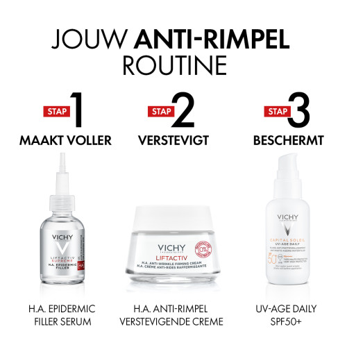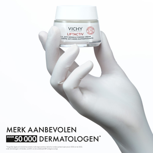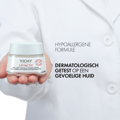 Vichy Liftactiv H.A. Anti-Rimpel Verstevigende Crème Parfumvrij 50ml hydrateert de huid grondig en herstelt het hyaluronzuurgehalte in de huid voor een voller effect. Na het aanbrengen oogt de huid strakker en steviger. Helpt rimpels en fijne lijntjes verbeteren. Door de leeftijd en externe aggressoren neemt de aanmaak van hyaluronzuur in de huid af, wat leidt tot rimpels en minder stevigheid. Dermatologisch getest op de gevoelige huid. Na aanbrengen:(1) +38% STRAKKER +16% STEVIGER Zelfbeoordeling:(2) 83% geeft aan dat de huid meer uitgerust is 70% geeft aan dat de huid steviger is 75% geeft aan dat de teint is verbeterd (1)Klinische score, 40 vrouwen, na één keer aanbrengen (2)Zelfbeoordeling, 52 vrouwen, 4 weken.