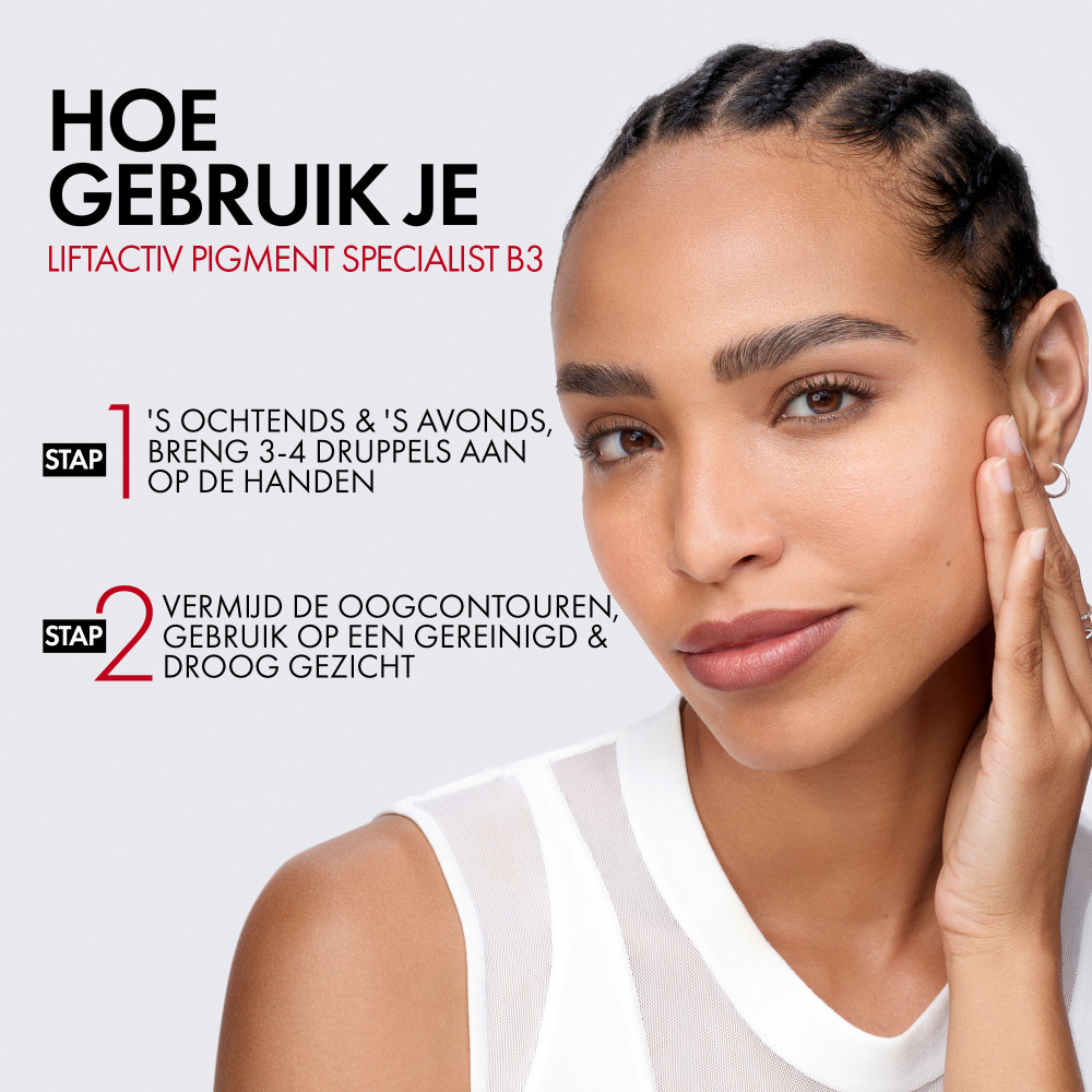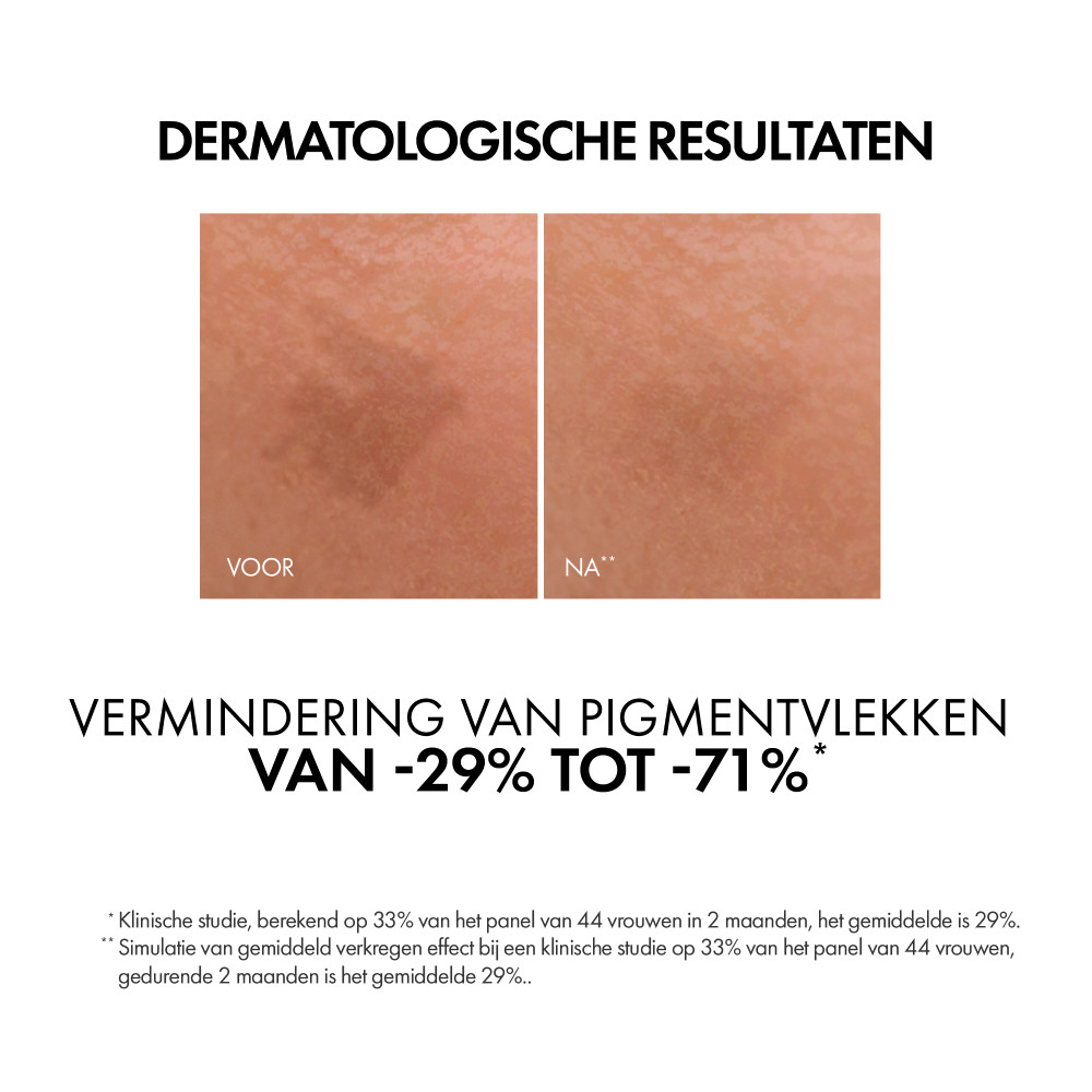 Vichy Liftactiv B3 Anti-Pigmentvlekken Serum 30ml speelt op verschillende manieren in op de huid. Het helpt de vorming van pigmentvlekken in de epidermis te voorkomen en tegelijkertijd de zichtbare vlekken aan het huidoppervlak te exfoliëren. Het B3 serum vermindert ook rimpels. De teint ziet er egaler en stralend uit. De lichte en niet-vettige textuur trekt snel in de huid. De hypoallergene formule bevat versterkend vulkanisch water van Vichy en een samenstelling van ingrediënten zoals vitamine B3 en glycolzuur, wat helpt de zichtbaarheid van pigmentvlekken en rimpels te verminderen. Dit serum is klinisch getest onder dermatologisch toezicht, en is geschikt voor alle huidtypes en alle fototypes. Met de leeftijd en externe factoren zoals vervuiling en UV-straling kunnen er pigmentvlekken, rimpels en een oneffen teint ontstaan. De oplossing van Vichy: Liftactiv Specialist B3 Serum, een innoverend serum dat deze zichtbare tekenen helpt te bestrijden. -29% pigmentvlekken*. -10% rimpels**. *Klinische studie, 44 personen gedurende 2 maanden, gemiddeld resultaat over de intensiteit van de kleur van de pigmentvlekken. **Klinische score, 44 proefpersonen na 8 weken.
