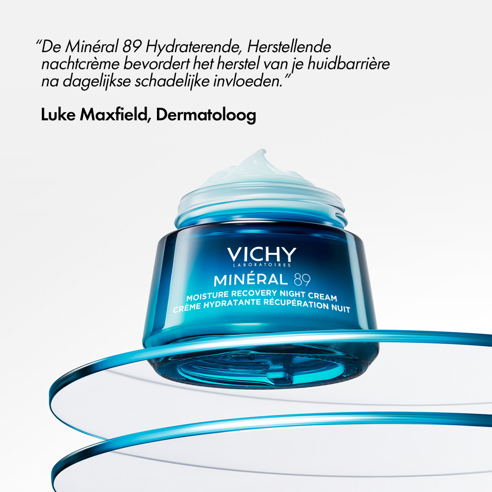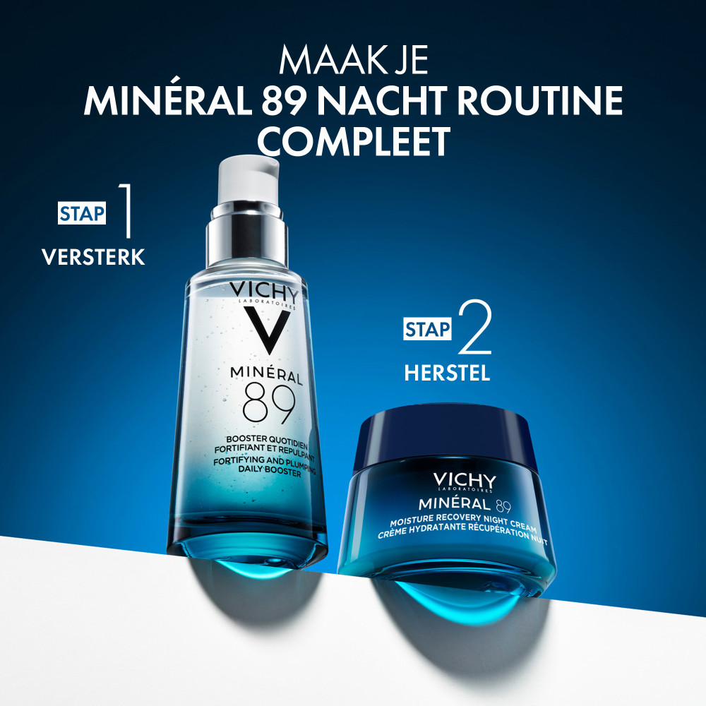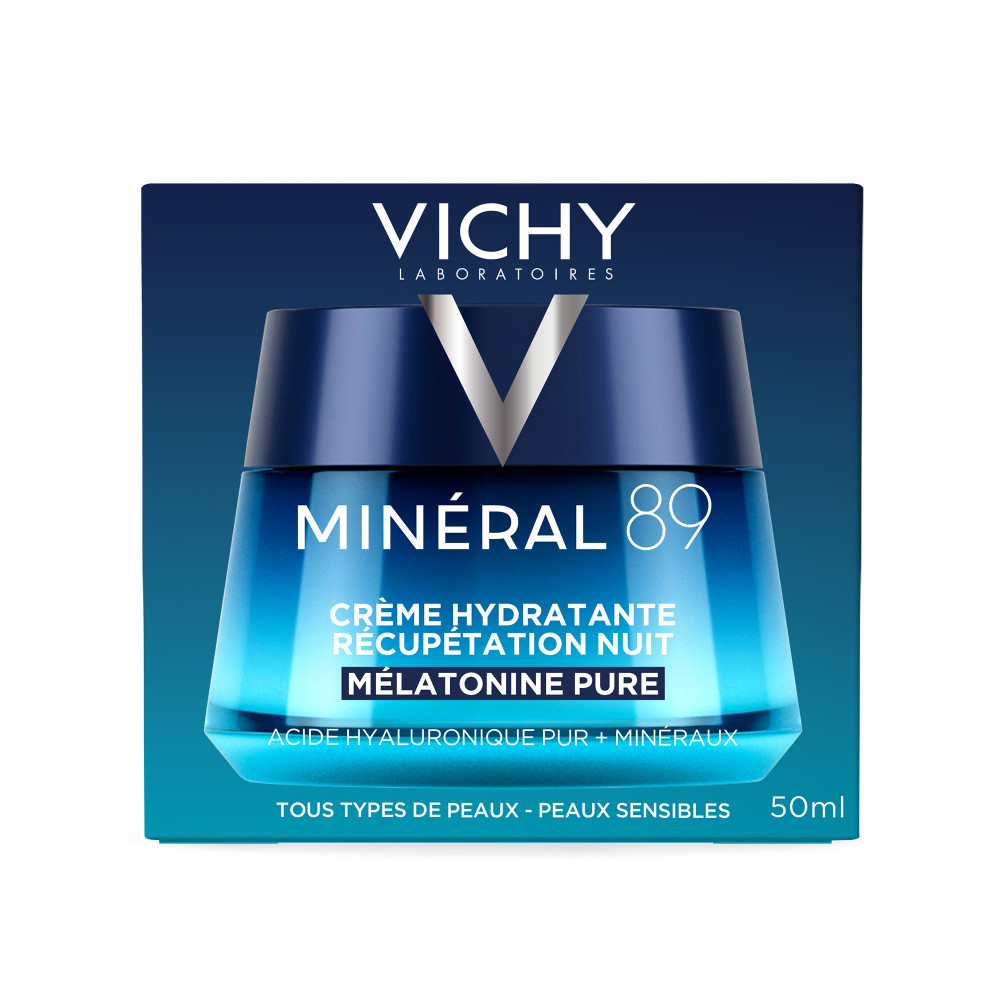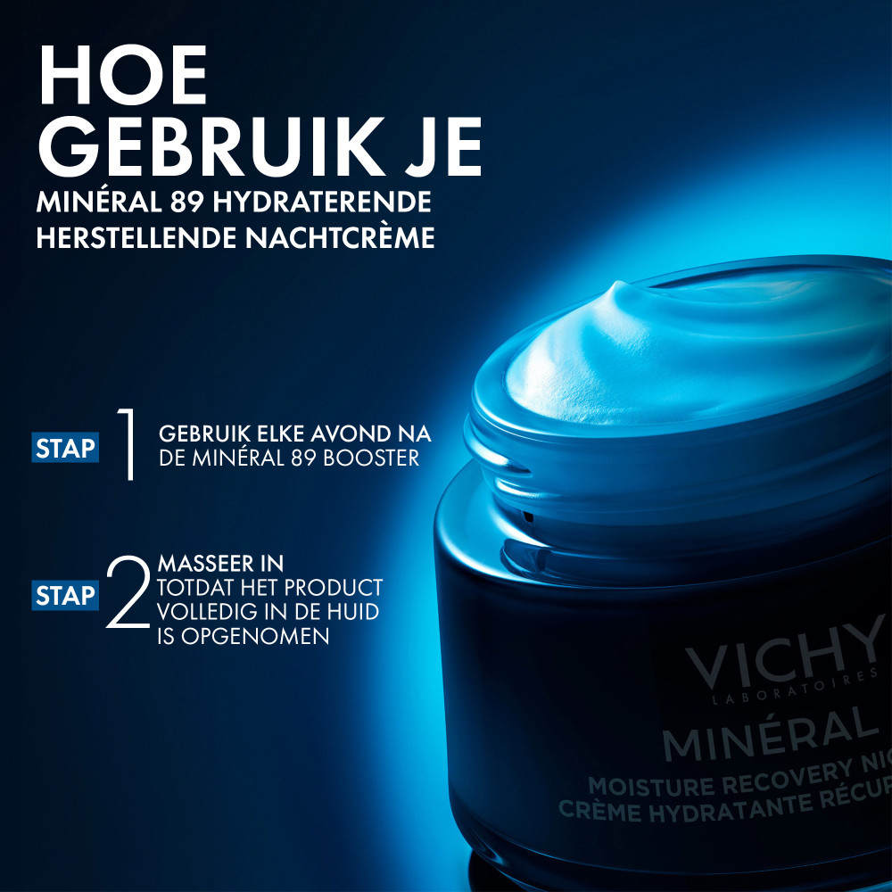 Vichy Minéral 89 Hydraterende Herstellende Nachtcrème 50ml zorgt voor een perfect gehydrateerde, vollere en stralende huid terwijl je slaapt. Deze nachtcrème met melatonine, hyaluronzuur en mineralen helpt de huid sneller te herstellen van dagelijkse schade waardoor ze er uitgerust uitziet, net zoals na een volledige nachtrust. Deze crème wordt onderdeel van je huidverzorgingsroutine om je huid te helpen herstellen terwijl je slaapt. De Vichy Minéral 89 Hydraterende, Herstellende Nachtcrème is verrijkt met drie actieve ingrediënten die samenwerken om het herstel van de huid te versnellen. Melatonine werkt 's nachts door de antioxiderende afweer van de huid te stimuleren en het herstel van de huid tegen dagelijkse schade te bevorderen. Hyaluronzuur hydrateert en maakt de huid voller dankzij zijn vermogen om tot 1.000 keer zijn eigen gewicht in water vast te houden. De mineralen in deze crème helpen de vochtbarrière van de huid te versterken en te herstellen, terwijl ze de huid beschermen tegen schadelijke omgevingsfactoren zoals vervuiling. De formule omhult de huid met een onzichtbare, comfortabele laag die geen sporen achterlaat op textiel. Geschikt voor alle huidtypes, om zichtbare tekenen van vermoeidheid, een droge huid en een doffe teint te bestrijden. Zonder alcohol. Bevat parfum. +30% sneller herstel van de huid* +67% hydratatie** +45% stralende huid*** +39% vollere huid*** +42% gladdere huid*** 94% vindt de huid er beter uitzien.**** 87% vindt dat de huid er uitgerust, vernieuwd en sterker uitziet.**** *Instrumentele test, 24 personen, na 1 uur. **Instrumentele test, 24 personen, na 30 min. ***Klinische test, 40 personen, 2 maanden. ****Zelfbeoordelingstest, 167 personen, 2 maanden.