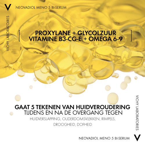 Vichy Neovadiol Meno 5 Bi Serum 30ml is een doeltreffende serum speciaal ontworpen voor de huid van vrouwen vlak voor, tijdens en na de overgang biedt geconcentreerde verzorging die het gezicht direct een boost geeft. Vichy heeft zich met een team van dermatologen en gynaecologen gespecialiseerd in de effecten van de overgang en de huid. Door hormonale veranderingen kan de huid tijdens de overgang namelijk sneller verouderen. Neovadiol Meno 5 Bi-Serum gaat pigmentvlekken en verslapping tegen, volgens onderzoek Volgens onderzoek helpt dagelijks gebruik van dit serum effectief tegen hyperpigmentatie, verslapping en verlies van lipiden: • -22% ouderdomsvlekken*; • -13% huidverslapping**; • +61% aanvulling van lipiden op de opperhuid***. *Instrumentele test – pigmentvlekgrootte, 41 vrouwen na 2 maanden. **Klinische beoordeling, 42 vrouwen na 2 maanden. ***Formule ontwikkeld met lipiden om de talg vermindering te compenseren tijdens de overgang