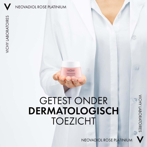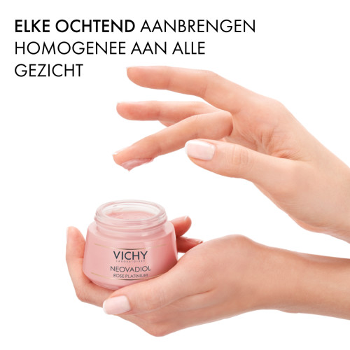 Vichy Neovadiol Rose Platinium Dagcrème 50ml is uitermate voedend en hydraterend, speciaal geformuleerd voor een rijpere, slappe huid die wat dunner wordt naarmate de jaren verstrijken. Een futloze uitstraling en minder vitaliteit? Deze dagcrème is verrijkt met roze pigmenten om weer kleur, kracht en een stralende gloed aan te brengen. Neovadiol Rose Platinum dagcrème heeft een voedende en versterkende formule voorzien van bijenwas en mineralen, die snel door de huid wordt geabsorbeerd waarna deze gelijk comfortabeler aanvoelt. Een rijke textuur, die de huid tegelijkertijd opfrist. De huid straalt, met een mooie gloed door de combinatie van ingrediënten zoals parelmoer en rozige pigmenten die elke huidtint complimenteren. Werkzaamheid Neovadiol Rose Platinum volgens onderzoek Zelfevaluatie onder 54 vrouwen, met een gemiddelde leeftijd van 68 jaar, wees het volgende uit over Vichy Neovadiol Rose Platinum. Onmiddellijk: • 78% ervaart een frissere huid; • 83% ervaart een soepelere huid; • 70% ervaart een elastischere huid; • 70% ervaart een gladdere huid. Na 1 maand: • 83% ervaart een egalere teint; • 74% ervaart een frissere huidteint; • 93% ervaart een comfortabeler gevoel; • 61% ervaart een sterkere huid; • 63% ervaart een vitalere huid.