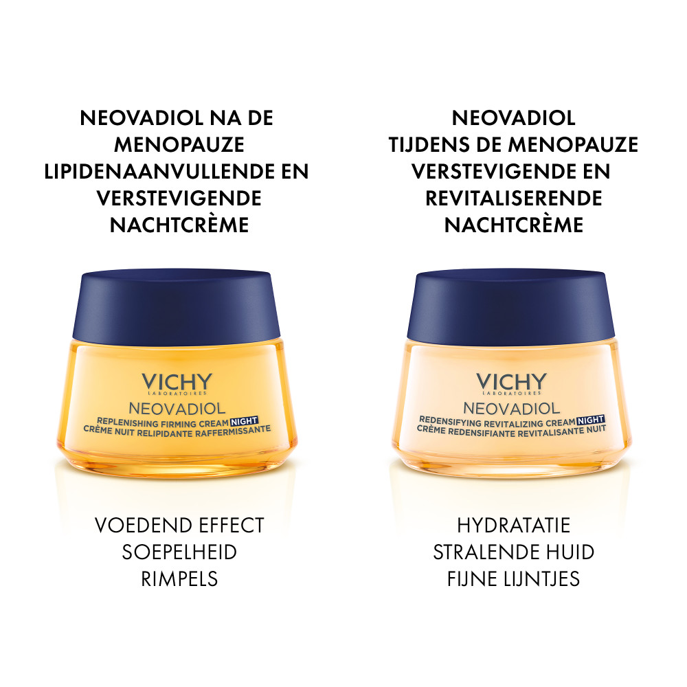 Vichy Neovadiol Lipidenaanvullende Revitaliserende Nachtcrème 50ml zorgt voor een intense voeding en versterking van droge huid als gevolg na de overgang. Een echte innovatie voor vrouwen tijdens en na de overgang, die door hormonale veranderingen vaak een veel drogere huid hebben. De nachtcrème is verrijkt met Omega's 3-6-9 en voedt de huid, terwijl proxylane helpt om haar meer volume te geven. Hypoallergeen en getest onder dermatologisch toezicht. Het is het nummer 1 merk dat in Europa wordt aanbevolen voor vrouwen na de overgang. Bij het wakker worden, ziet de huid er gladder, steviger en voller uit. Geschikt voor alle huidtypes, ook voor de gevoelige huid en voor jongere vrouwen die nog niet na de overgang zitten maar een droge huid hebben. +100% oppervlakte lipiden in de epidermis* -74% droogheid** +44% soepelheid** *Helpt tot 100% van het verlies aan oppervlakte lipiden in de epidermis aan te vullen tijdens de overgang. Formule ontwikkeld met lipiden om de afname in talgafscheiding tijdens de overgang aan te vullen. **Klinische score onder 52 vrouwen na 1 maand.